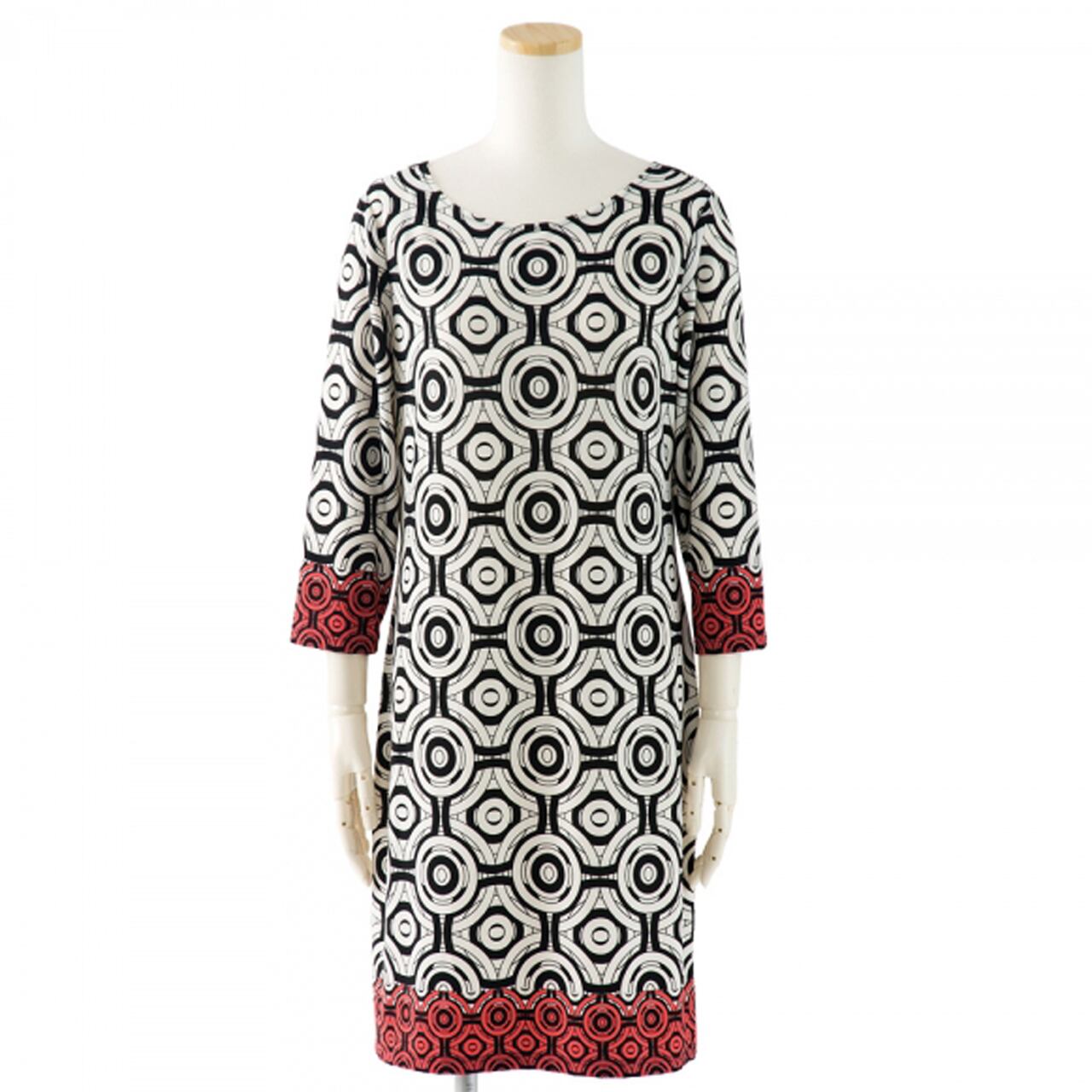 白黒の幾何学模様の袖口、裾に赤の配色がとてもモダンなワンピースです。